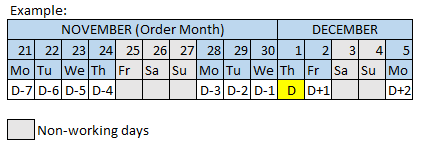 For monthly order related due dates in WisE, D-day is the first working day of the month after the order month (target day = start of supplier delivery). The working days are based on the working calendar of the Export office (or office buying from supplier).